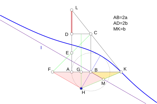![]() De acuerdo con la imagen de la derecha, sea y, por simplicidad, supóngase y Construir el rectángulo según los datos dados (para la duplicación del cubo, ); dividiendo por la mitad se obtiene el punto medio , que se une con entonces, prolongar hasta que encuentre en a la extensión de Desde punto medio de trazar la perpendicular a y con el centro en y el radio igual a (la mitad de ) cortar con un arco de circunferencia dicha perpendicular en el punto del lado de en el que no se encuentra el rectángulo . Unir con y desde se traza la recta paralela a . La concoide tiene como polo, como recta base y una distancia igual a La concoide así descrita se encuentra con la línea recta en un punto y las dos líneas rectas y identifican el segmento en Indicado con el punto de encuentro de la línea recta con la línea recta , se muestra que los dos segmentos y son las dos medias proporcionales buscadas. Efectivamente, definiendo y , como consecuencia de las construcciones realizadas, se tiene que: y por lo tanto al unir con Pero de los triángulos semejantes se deduce que y observando que y que sustituyendo en la proporción anterior, se tiene que: A partir de aquí, se obtiene el cuadrado y eliminando los denominadores Al operar y reducir el resultado se llega a es decir, a partir del cual y siendo diferente de cero (ya que y son medidas de segmento) necesariamente resulta que es decir De la semejanza de los triángulos se tiene que y, por tanto, que permite escribir Elevando al cubo pero y por lo tanto simplificando se obtiene Entonces: La tercera y primera igualdad, divididas miembro por miembro, dan