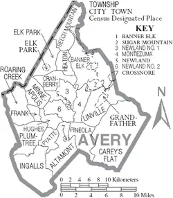 El condado se divide en diecinueve municipios: Municipio de Altamont, Municipio de Banner Elk, Municipio de Beech Mountain, Municipio de Carey's Flat, Municipio de Cranberry, Municipio de Elk Park, Municipio de Frank, Municipio de Heaton, Municipio de Hughes, Municipio de Ingalls, Municipio de Linville, Municipio de Minneapolis, Municipio de Montezuma, Municipio de Newland No. 1, Municipio de Newland No. 2, Municipio de Pineola, Municipio de Plumtree, Municipio de Pyatte y Municipio de Roaring Creek.