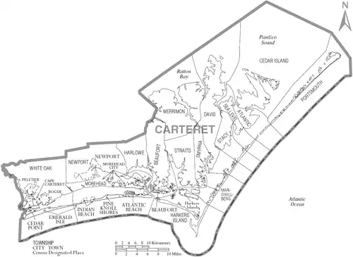 - Esta obra contiene una traducción derivada de «Carteret County, North Carolina» de Wikipedia en inglés, publicada por sus editores bajo la Licencia de documentación libre de GNU y la Licencia Creative Commons Atribución-CompartirIgual 4.0 Internacional.