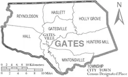 - Esta obra contiene una traducción derivada de «Gates County, North Carolina» de Wikipedia en inglés, publicada por sus editores bajo la Licencia de documentación libre de GNU y la Licencia Creative Commons Atribución-CompartirIgual 4.0 Internacional.
