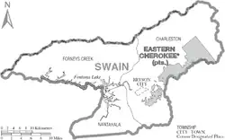 - ↑ a b «Swain County, North Carolina». Oficina del Censo de los Estados Unidos. Consultado el 28 de mayo de 2023.
