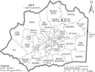 - Esta obra contiene una traducción derivada de «Wilkes County, North Carolina» de Wikipedia en inglés, publicada por sus editores bajo la Licencia de documentación libre de GNU y la Licencia Creative Commons Atribución-CompartirIgual 4.0 Internacional.