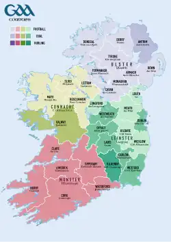 A continuación se enumeran las 32 juntas de condado con sede en Irlanda y la provincia (y, por lo tanto, el consejo provincial ) a la que cada una está afiliada. También se proporciona un mapa que muestra la ubicación de la provincia, es decir, norte, sur, este, oeste.