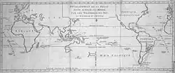 Mapa de la ruta de la expedición de circunnavegación al mundo (1766-69). Los nombres de las escalas están en francés y corresponden a los nombres de la época.