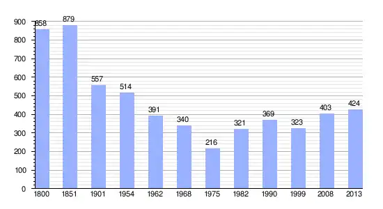 Los datos demográficos contemplados en este gráfico de la comuna de Condeau[4] se han cogido de 1800 a 1999 de la página francesa EHESS/Cassini, y los demás datos de la página del INSEE.[5]