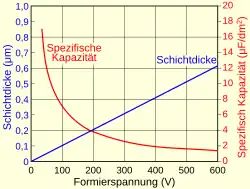 El óxido amorfo tiene una proporción dieléctrica de ~ 1,4 nm / V. En comparación con el óxido de aluminio cristalino que tiene una relación dieléctrica de ~ 1,0 nm / V, la variedad amorfa tiene una capacidad 40% inferior a la misma superficie de ánodo.[8] El inconveniente del óxido cristalino es la mayor sensibilidad al esfuerzo de tracción que puede provocar microgrietas cuando se somete a estresores mecánicos (de bobinado) o térmicos (de soldadura) que dan lugar a procesos de post-formación más altos.