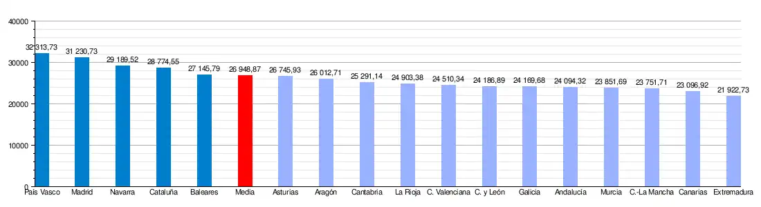 En 2022, los salarios medios brutos anuales en España presentan diferencias notables según la comunidad autónoma. Las regiones con mayores ingresos son el País Vasco, con 32 313,73 € brutos anuales, seguido de la Comunidad de Madrid, con 31 230,73 €, y Navarra, con 29 189,52 €. También destacan Cataluña, en cuarto lugar, con 28 774,55 €, y las Islas Baleares, en quinto lugar, con 27 145,79 €, superando la media nacional. En contraste, las comunidades con menores salarios son Extremadura, que se sitúa en la cola con 21 922,73 €, seguida de Canarias, con 23 096,92 €, y Castilla-La Mancha, con 23 751,71 €. Estas diferencias reflejan desigualdades económicas importantes entre territorios, influenciadas por factores como el tejido productivo, el nivel de empleo cualificado y el coste de vida, marcando una brecha territorial significativa.[66]