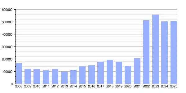| Salario mínimo en España desde 2002 hasta 2025 (en EUR, 14 mensualidades)[72][73] |