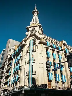 El edificio fue diseñado por el arquitecto ítalo-argentino Francisco Gianotti y es considerado un emblema del art noveau. El edificio se halla entre los más notables de su época por la calidad de los materiales empleados en su construcción, muchos de ellos importados. Se destacan los revestimientos de mármol de las columnas, pilastras y paneles del interior de los locales, de gran suntuosidad, así como algunas obras de arte traídas especialmente de Italia, que dan un carácter particularmente lujoso a sus salones.