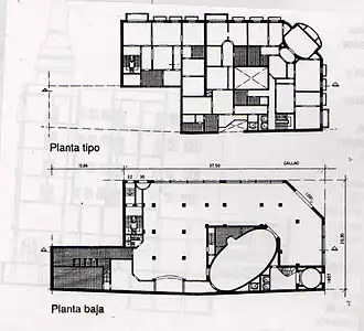 El inmueble, que tiene la forma básica del edificio académico típico de Buenos Aires, está constituido por tres subsuelos, una planta baja y cinco pisos. Los salones para fiestas estaban en la esquina, y los tres subsuelos alojaban una planta de elaboración integral, una fábrica de hielo, las bodegas, los depósitos y el taller mecánico. La envolvente superior servía para viviendas y oficinas. Para que no interfirieran con la actividad de la confitería, las columnas de hierro se colocaron de manera que sostuviesen los subsuelos y la planta baj,a y sobre ellas se colocó la estructura de hormigón armado que sostiene el resto del edificio.[13]