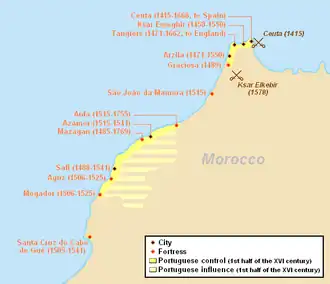 En total, está documentado que los portugueses se apoderaron de seis ciudades marroquíes y construyeron seis fortalezas independientes en la costa atlántica marroquí, entre el río Lucus en el norte y el río Sus en el sur.
