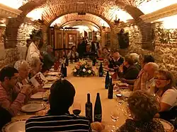 El Cardenal Arzobispo Rouco Varela y el Concejal Presidente de la Junta Municipal de Carabanchel Carlos Izquierdo Torres con la Junta de Gobierno de la Congregación, en una comida de hermandad.