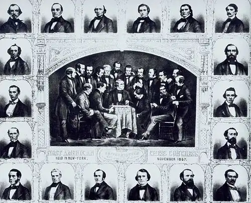 A la derecha se encuentra la litografía del 1º Congreso. Aparecen todos los miembros del Congreso, incluidos los que no jugaron en el Torneo Principal. En la fila superior: el Coronel Charles Mead (presidente), George Hammond, Frederic Perrin, Daniel Willard Fiske, Hiram Kennicott, y Hardman Philips Montgomery. Columna de la izquierda: Hubert Knott, Ludwig Paulsen, y William Allison. Fila inferior: Theodor Lichtenhein, James Thompson, Charles Henry Stanley, Alexander Beaufort Meek, Samuel Robert Calthrop y Napoleón Marache. Columna derecha: William James Fuller, Paul Morphy, y Benjamín Raphael.