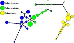 Sin embargo, estas tres especies se pueden separar en la proyección en el componente principal del ramaje no lineal.[6] El conjunto de datos se aproxima por el árbol más cerca con alguna sanción por el número excesivo de nódulos, doblándose y estirándose. Luego el mapa metro se construye.[4] Se proyectan los puntos de datos para el nódulo más cerca. Por cada nódulo se prepara el gráfico circular de los puntos proyectados. La zona del gráfico es proporcional al número de los puntos proyectados. Se ve claro del gráfico que la mayoría absoluta de las muestras de las especies distintas de Iris son de los nódulos diferentes. Sola una fracción pequeña de Iris-virginica se mezcla con Iris-versicolor (la mezcla de nódulos azules con verdes en el diagrama). Así las tres especies de Iris (Iris setosa, Iris virginica y Iris versicolor) se separan por los procedimientos no supervisados del análisis del componente principal no alineado. Para discriminarlos es suficiente seleccionar el nódulo correspondiente en el árbol principal.