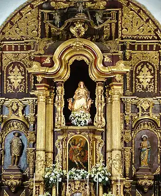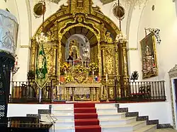 En el retablo mayor, fechado en el siglo XVIII, llaman la atención cuatro columnas que soportan un arco mixtilíneo. El conjunto tiene como imagen principal a la Virgen María. Sobresalen también por su interés artístico la escultura del Cristo de la Caridad, del siglo XVI, la virgen de la Soledad del siglo XVIII y la imagen de San José.