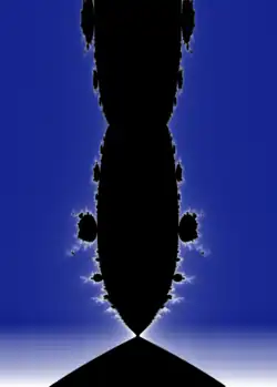 y si el exponente es negativo, la secuencia es estable. Los píxeles blancos en la imagen son los parámetros c para los cuales el exponente es positivo, también conocido como inestable. Los colores muestran los períodos de los ciclos que atraen las órbitas. Todos los puntos de color azul oscuro (exterior) son atraídos por un punto fijo, todos los puntos del medio (azul más claro) son atraídos por un ciclo de período 2 y así sucesivamente.