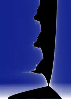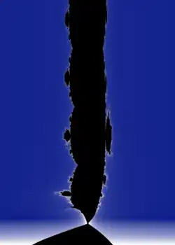 Un método alternativo es representar el exponente en el eje vertical. Esto requiere fijar el valor real o imaginario y representar el valor restante en el eje horizontal. El conjunto resultante se eleva verticalmente desde el origen en una columna estrecha hasta el infinito. La ampliación revela una complejidad creciente. La primera protuberancia o pico prominente se ve en un exponente de 2, la ubicación del conjunto tradicional de Mandelbrot en su sección transversal. La tercera imagen aquí se representa en un plano que se fija en un ángulo de 45 grados entre los ejes real e imaginario. [8]