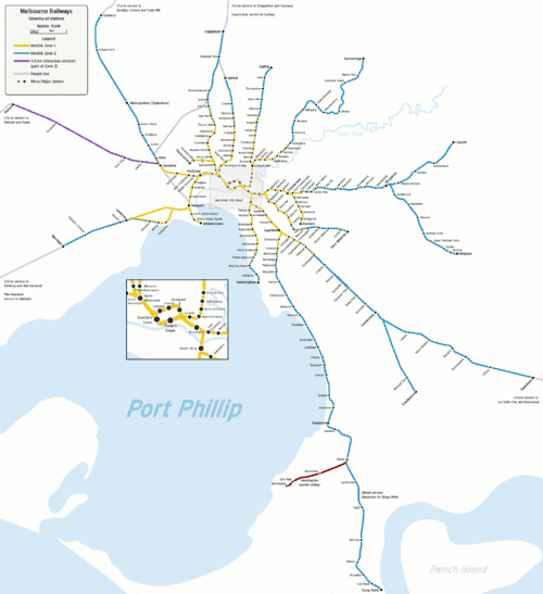 La red cuenta con 20 líneas, agrupadas por sectores, excepto la City Loop que opera en el centro de la ciudad; 223 estaciones, muchas de las cuales sirven a varias líneas y 832,5 km de vías férreas: