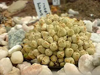 Está formada por pequeños cuerpos carnosos que forman grupos compactos de hojas casi esféricas, soldadas hasta el punto de que sólo una muy pequeña diferencia separan a las dos hojas. En la naturaleza, los grupos de hojas se esconden entre las rocas y en las grietas, que retienen depósitos apreciable de arcilla y arena.