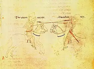 ![]() Duelo entre Odoacro y Teodorico en el Códice Palatino Vaticano del siglo XII. | ||||