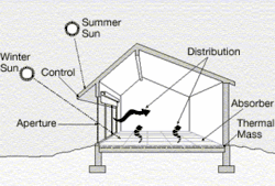 En el diseño de edificios solares pasivos, las ventanas, paredes y pisos están diseñados para recolectar, almacenar y distribuir energía solar en forma de calor en el invierno y rechazar el calor solar en el verano. Esto se denomina diseño solar pasivo o diseño climático porque, a diferencia de los sistemas de calefacción solar activos, no implica el uso de dispositivos mecánicos y eléctricos.