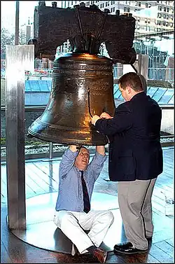 La conservación preventiva, también conocida como mantenimiento de colecciones o gestión de riesgos, abarca todas las acciones realizadas para prolongar la vida de un objeto.” [9] y es un elemento importante de la política de un museo. A los miembros de la profesión museística se les encomienda crear y mantener un entorno protector para las colecciones bajo su cuidado. Un buen programa de conservación preventiva minimiza la necesidad de un tratamiento de conservación bloqueando, evitando o minimizando los agentes de deterioro.[10] La planificación de emergencia, la salvaguarda ambiental y la monitorización son diversas formas de conservación preventiva. La investigación científica continúa descubriendo nuevas formas de salvaguardar las colecciones. Hoy varios dispositivos de monitorización ayudan en la observación de cambios en los agentes de deterioro y otros cambios que pueden ayudar en el diagnóstico de la actividad destructiva antes de que sea un desastre. En la imagen de la derecha, se conecta un dispositivo a la Campana de la Libertad (Liberty Bell) para monitorizar cualquier cambio en la grieta. Los objetos del patrimonio metálico son sensibles a las condiciones ambientales, como la exposición a la luz y luz ultravioleta, la temperatura, la humedad relativa, el agua y la humedad, y varios contaminantes atmosféricos, especialmente las sales de cloruro . Es necesario planificar la protección contra amenazas de desastres naturales como inundaciones o incendios para mantener un entorno que mantenga a todos los agentes de deterioro dentro de límites seguros y controlar su fluctuación ayudará a la preservación de los metales.