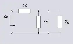 La impedancia característica de una línea de transmisión, 𝑍0, se define como la impedancia que se refleja en una línea infinitamente larga. Una línea de este tipo nunca devolverá una reflexión, ya que la onda incidente nunca llegará al extremo para ser reflejada. Cuando se considera una longitud finita de la línea, el resto de la línea puede ser reemplazado por 𝑍0 como su circuito equivalente. Esto es así porque el resto de la línea sigue siendo infinitamente largo y, por tanto, equivalente a la línea original. Si el segmento finito es muy corto, entonces en el circuito equivalente se modelará mediante una red en L formada por un elemento de 𝑑𝑍 y uno de 𝑑𝑌; el resto viene dado por 𝑍0. Esto da como resultado la red mostrada en la figura 3, que puede analizarse para 𝑍0 utilizando los teoremas habituales de análisis de redes,[17][18]