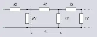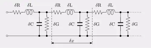 Las constantes de línea no pueden representarse simplemente como elementos agrupados en un circuito, sino que deben describirse como elementos distribuidos. Por ejemplo, "trozos" de la capacitancia están entre "trozos" de la resistencia. Por muchos trozos en que se dividan la R y la C, siempre se puede argumentar que deberían dividirse aún más para representar adecuadamente el circuito, y después de cada división se aumenta el número de mallas del circuito. Esto se muestra en la figura 1. Para obtener una representación real del circuito, los elementos deben hacerse infinitesimalmente pequeños, de modo que cada elemento se distribuya a lo largo de la línea. Los elementos infinitesimales en una distancia infinitesimal 𝑑𝑥 vienen dados por;[14]
