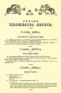 La Constitución del Principado de Serbia (Serbo-eslavo Уставъ Княжества Сербїе), conocida como Constitución de Sretenje, es la primera constitución del Principado de Serbia que fue adoptada en Kragujevac en 1835. La constitución fue redactada por Dimitrije Davidovic. La Constitución dividió al gobierno en legislativo, ejecutivo y judicial, que todavía se considera el estándar de democracia y constitucionalidad. El gobierno está formado por el príncipe, el consejo de estado y la asamblea nacional. Hoy en día, esta división le vendría bien al presidente, al gobierno y a la asamblea nacional. La constitución estipula que el príncipe y el consejo de estado comparten el poder ejecutivo. Se proclamaron los derechos y libertades de los ciudadanos, tales como: inviolabilidad de la persona, independencia del poder judicial y derecho a un juicio legal, libertad de circulación y residencia, inviolabilidad del apartamento, derecho a elegir una ocupación, igualdad de ciudadanos, independientemente de la religión y la nacionalidad. La constitución abolió la esclavitud y las relaciones feudales. Aunque fue aprobada por la Gran Asamblea Nacional y confirmada por el juramento del Príncipe Milos Obrenovic, la constitución fue suspendida después de solo 55 días bajo la presión de las grandes potencias feudales (Turquía, Rusia y Austria). En la actualidad, el original de uno de los actos jurídicos más valiosos del Nuevo Siglo (1453-1918) en los Balcanes, que estaba encuadernado y encuadernado por Gligorije Vozarovic, se conserva en los Archivos de Serbia.