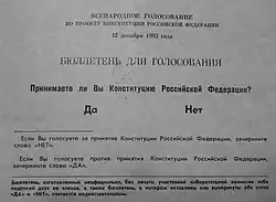 - ↑ «О ПРОВЕДЕНИИ ВСЕНАРОДНОГО ГОЛОСОВАНИЯ ПО ПРОЕКТУ КОНСТИТУЦИИ РОССИЙСКОЙ ФЕДЕРАЦИИ. Указ. Президент РФ. 15.10.93 1633. Предпринимательское право». www.businesspravo.ru (en ruso). Archivado desde el original el 6 de noviembre de 2013. Consultado el 20 de junio de 2025.