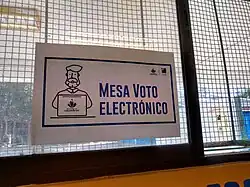 Cartel en un local de votación de Independencia anunciando las mesas receptoras de votos electrónicos.