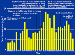 La contaminación marina se produce también a través de la atmósfera. El viento arrastra polvo y escombros, incluyendo bolsas de plástico, hacia el mar desde vertederos y otras zonas terrestres. Polvo proveniente del Sahara se traslada alrededor de la periferia sur de la cresta subtropical hacia el Caribe y Florida durante la temporada cálida cuando la cresta se fortalece, moviéndose hacia el norte a través del Atlántico subtropical. Otro movimiento global de polvo ocurre desde los desiertos Gobi y Taklamakan, por Corea, Japón y el norte del Pacífico a las islas hawaianas.[19] El aumento de los períodos de sequía en África a partir de la década de 1970 también ha empeorado el traslado de polvo. Aunque existe una gran variabilidad en el traslado anual de polvo hacia el Caribe,[20] el flujo suele ser mayor durante las fases positivas de la oscilación del Atlántico Norte.[21] El USGS vincula los episodios de descarga de polvo a una disminución en la salud de los arrecifes de coral en todo el Caribe y Florida, principalmente desde la década de 1970.[22]