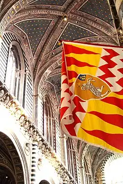 Su símbolo es una loba con dos gemelos. Sus colores son negros y blancos, combinados con naranjas. Esta loba se refiere a la leyenda de que Siena fue fundada por Senius, el hijo de Remo quién, junto a su gemelo Rómulo, fueron criados por un lobo. Debido a este, Lupa ciudad de hermana es Roma .