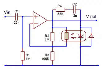 Esquema de un CGA utilizado en la red telefónica analógica; la retroalimentación desde el nivel de salida al de ganancia se efectúa a través de un optoaislador resistivo Vactrol