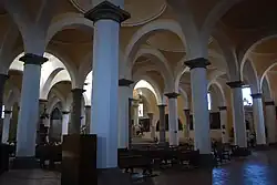 Su techo, originalmente de madera, causa admiración a quien lo observa, ya que está conformado por 49 cúpulas que cubren las siete naves del templo y las dos series de capillas laterales. Conserva una pila de agua bendita la cual nos muestra rasgos indígenas y franciscanos.