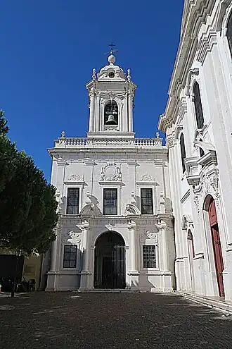 Las fachadas de la iglesia y la entrada del convento se encuentran en un ángulo de 90 grados. Sobre la entrada al convento que se levanta el campanario, diseñado por Manuel da Costa Negreiros y que data de 1738.