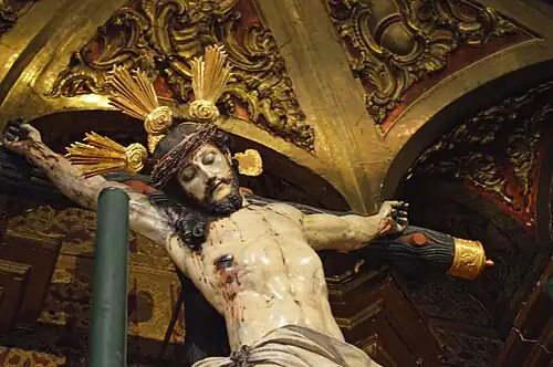De su interior destaca su retablo mayor de finales del XVIII, obra de 1763 de Gonzalo Pomar de estilo rococó en madera dorada, así como el Cristo Crucificado de la Veracruz, que algunos estudiosos suponen traído a la ciudad desde Nápoles en el año 1733.