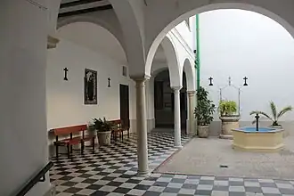 El interior tiene un patio y una iglesia comenzada a construir en 1628[2]