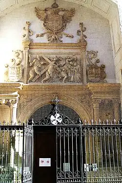 En uno de sus extremos se localiza la iglesia. La portada exterior, abierta en el muro oeste, consta de un arco de medio punto flanqueado por dos pares de columnas estriadas y adosadas bajo arquitrable listado. Sobre la cornisa, el espacio correspondiente al frontón está ocupado por un relieve con la escena de Cristo camino del Calvario, al que flanquean volutas con los escudos heráldicos de los Aguirre y los Esquível, y corona un escudo imperial de Carlos I. La portada está protegida por una reja y una malla recientemente incorporada, a continuación de su restauración, para protegerla de las palomas.