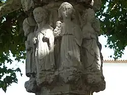 Frente a la iglesia hay una cruz de término gótica, profusamente historiada.