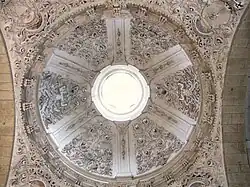 Por encima de las pilastras, remata todo el interior un cornisamento muy desarrollado y decorado, en contraste con la desnudez de los muros. Forman esta cornisa una serie de molduras, quebradas en los ángulos del edificio, y ménsulas que se alternan rítmicamente en el friso, con decoración intercalada muy compleja de roleos, veneras, vegetación carnosa... la techumbre es de bóvedas de cañón con lunetos, de forma típicamente barroca, y en ellas la decoración del friso se hace aún más abigarrada y compleja. Predominan las formas vegetales sinuosas enrolladas en espiral y acompañadas por florones, racimos y hojarasca. En la cúpula y sus pechinas, esta decoración se enriquece con figuras de angelotes y motivos heráldicos. Toda esta decoración, excelente muestra del arte de la yesería, fue proyectada por el maestro Antonio de Canales, y constituye una de las mejores muestras de barroco decorativo en la provincia de Palencia.