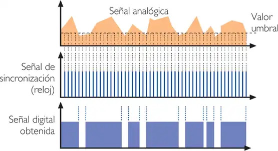 • Cuando la señal analógica se encuentra por encima del valor umbral, la señal digital toma un valor máximo (1).