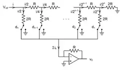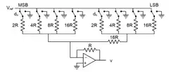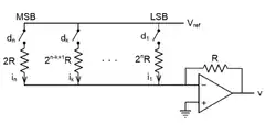 Cada llave simboliza un conmutador, el cual puede ser implementado por transistores JFET y en cuya compuerta está relacionada eléctricamente con la salida de un bit de un circuito digital. Siendo el bit con mayor peso ponderado (MSB) y LSB el bit con menor peso de ponderación. Mientras mayor es la ponderación del bit, mayor es la corriente que circula por la rama. Dichas concurren en un único nodo y según ley de corriente de Kirchhoff, la suma de estas convergen en la entrada no inversora, de manera la tensión de salida es: