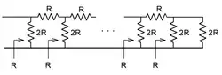 Una red resistiva, como la indicada en la figura 3, tiene la particularidad de que cualquiera sea el número de secciones la resistencia vista (excepto al final) es R. Este circuito puede usarse como se muestra en la figura 6 para obtener un conversor digital analógico muy eficiente.