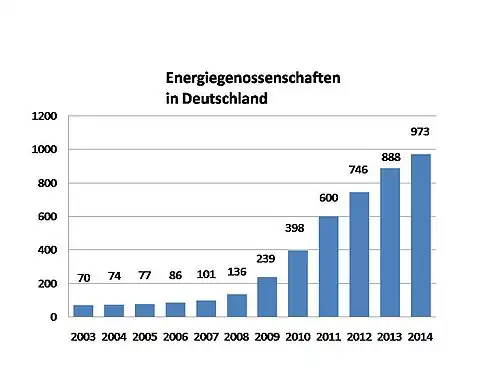 Más recientemente, y con la motivación de construir un modelo energético basado en producción renovable y gestionado de forma social, han surgido numerosas cooperativas energéticas en España.[4] Esta segunda ola de cooperativas se ha centrado por el momento mayoritariamente en la comercialización de energía eléctrica de origen renovable. Estas cooperativas abarcan a fecha de noviembre de 2018 más de 70.000 socios y 100.000 contratos repartidos por todo el país, y están caracterizadas por un fuerte crecimiento anual.[13][1]