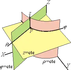 Coordenadas cilíndricas y ejes cartesianos relacionados.
