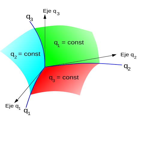 Las superficies q1 = constante, q2 = constante, q3 = constante se denominan superficies de coordenadas; y las curvas espaciales formadas por su intersección dos a dos se denominan curvas de coordenadas. Los ejes de coordenadas están determinados por las tangentes a las curvas de coordenadas en la intersección de tres superficies. En general, no son direcciones fijas en el espacio, como ocurre con las coordenadas cartesianas simples y, por lo tanto, generalmente no existe una base global natural para las coordenadas curvilíneas.