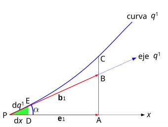 Considérese la curva unidimensional que se muestra en la Fig. 3. En el punto P, tomado como origen, x es una de las coordenadas cartesianas y q1 es una de las coordenadas curvilíneas. El vector de la base local (no unitario) es b1 (anotado como h1 anteriormente, con la letra b reservada para los vectores unitarios) y está construido sobre el eje q1 que es tangente a esa línea de coordenadas en el punto P. El eje q1 y, por lo tanto, el vector b1 forman un ángulo con el eje cartesiano x y el vector de la base cartesiana e1.