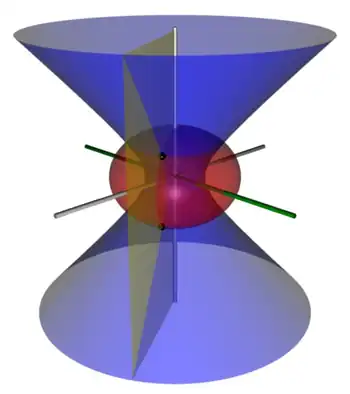 Figura 3: Isosuperficies coordenadas para un punto P (mostrado como una esfera negra) en las coordenadas esferoidales oblatas alternativas (σ, τ, φ). Como antes, el esferoide oblato correspondiente a σ se muestra en rojo, y φ mide el ángulo azimutal entre los semiplanos verde y amarillo. Sin embargo, la superficie de τ constante es un hiperboloide de una sola hoja, que se muestra en azul. Esto produce una degeneración doble, mostrada por las dos esferas negras ubicadas en (x, y, ±z)