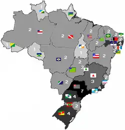 El reparto de los participantes por vía campeonato estatal (54 plazas) fue así: Los 5 primeros estados en la clasificación por estados de la CFB (São Paulo, Río de Janeiro, Rio Grande do Sul, Minas Gerais y Paraná) obtienen 3 plazas, los colcados entre la 6.º a la 22.º obtienen 2 plazas y los 5 peores (Acre, Rondônia, Tocantins, Amapá y Roraima) obtienen sólo 1 plaza.
